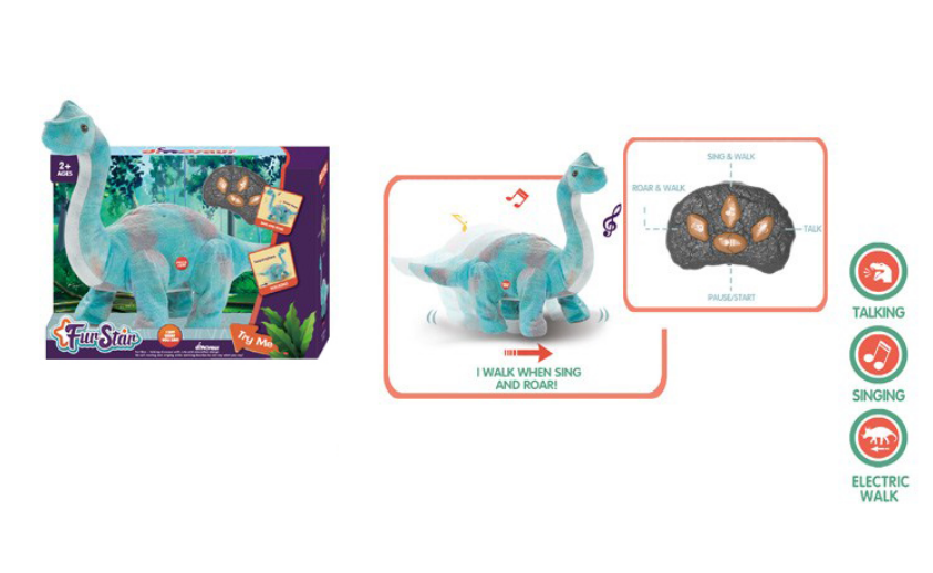1.Two switches :① "Try Me" for demonstration function, while walking to sound dinosaurs, 6 seconds :② "Play" - remote control. Three key functions: one is to walk while the dinosaur sound; The second is to make music while walking; The third is to learn how to speak and walk at the same time.